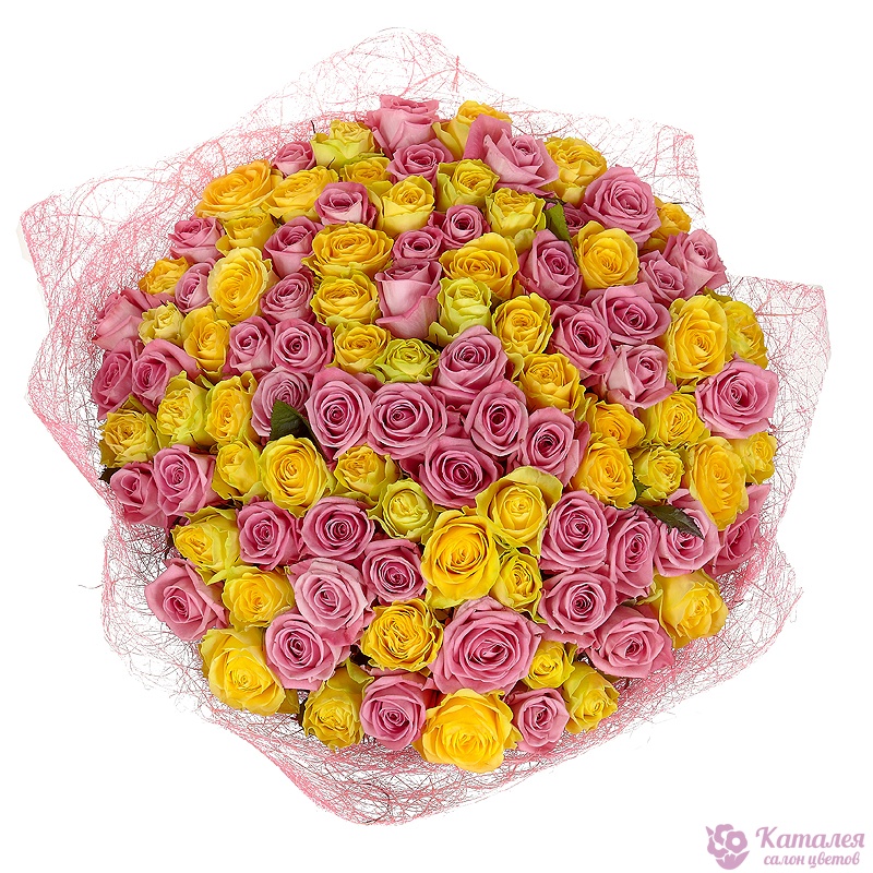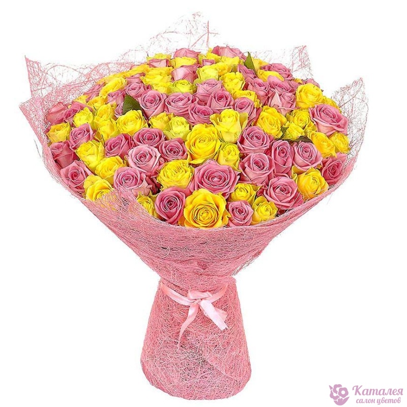 Букет состоит из 51 розовая роз, 50 желтых роз, красивая упаковка, атласная лента.