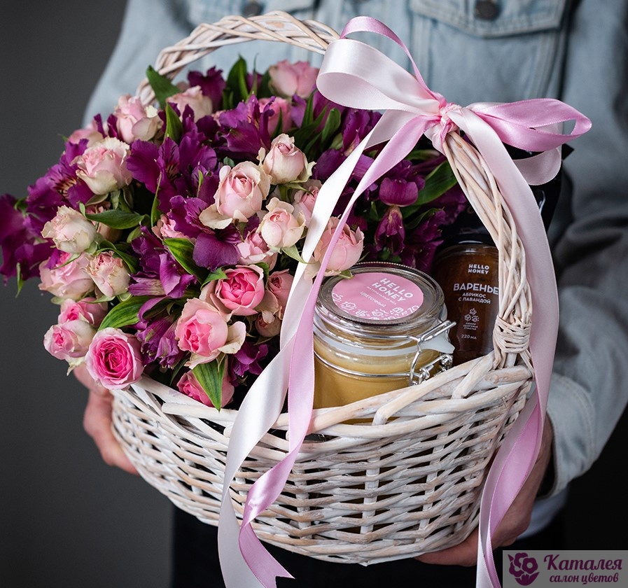 В набор входит натуральный мёд, домашнее варенье и пакет травяного чая. Настоящее украшение корзины — живые цветы альстромерии и кустовые розы. Это одни из самых красивых растений, которые не оставят равнодушной ни одну девушку. Хотите произвести впечатление? Этот подарок сделает всё за вас!