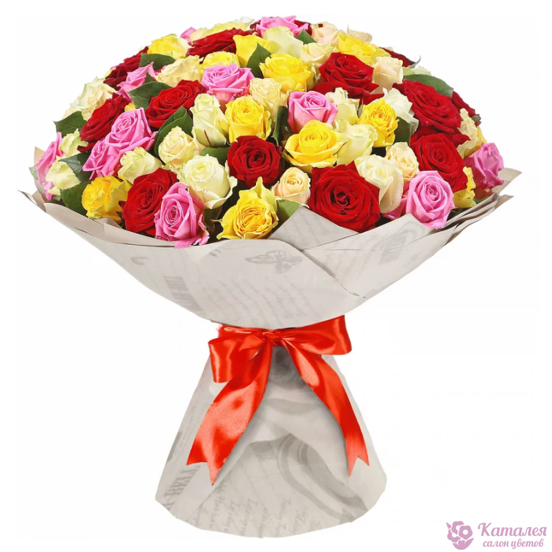 Букет состоит из MIX из 101 желтой / красной / белой / розовой розы, красивая упаковка, лента.